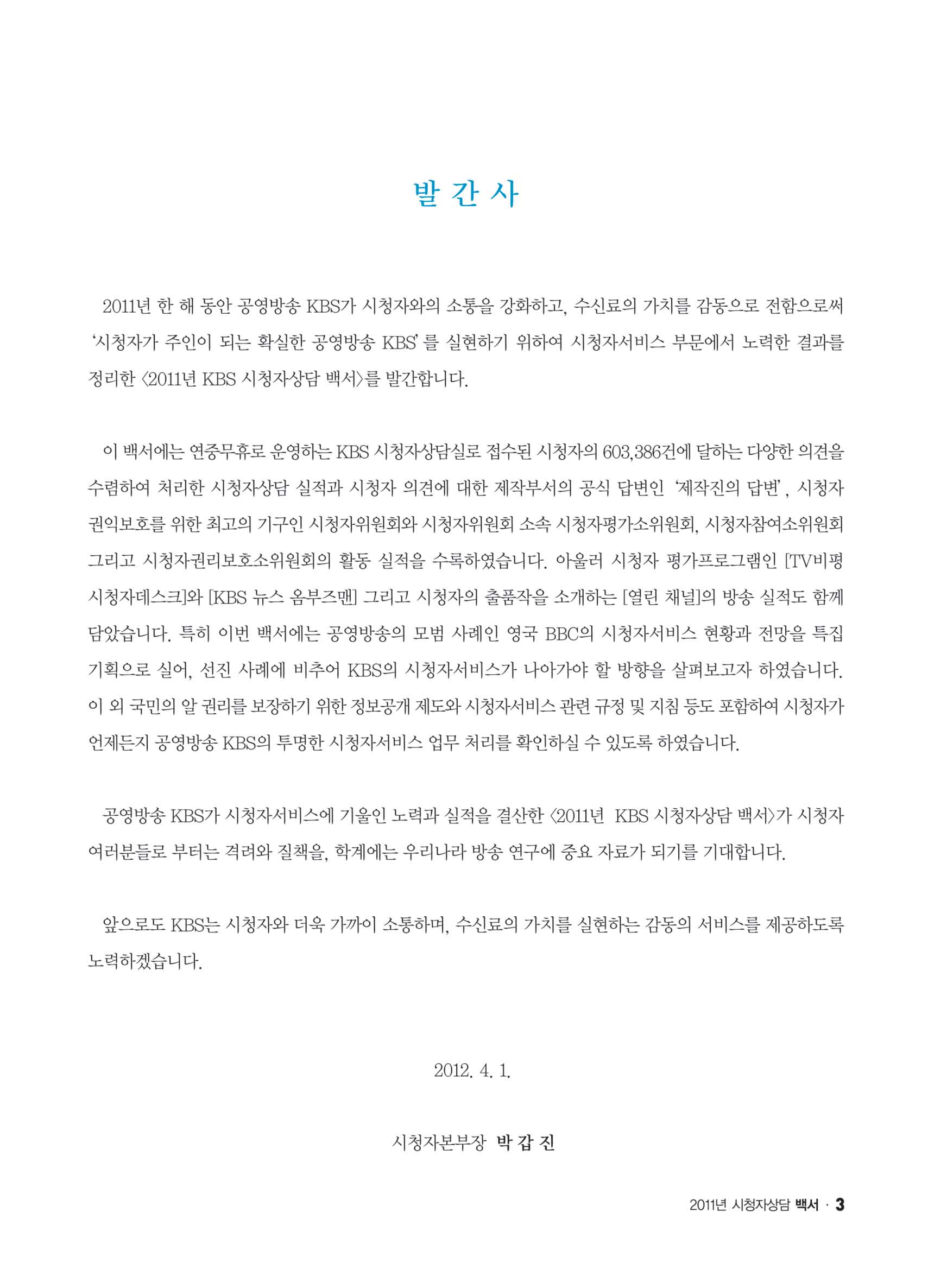 <2011년 KBS 시청자상담 백서>가 다음과 같이 발간되었습니다.